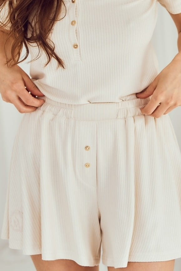 Szorty tej unikatowej piżamy damskiej wyróżniają się komfortem i funkcjonalnością, oferując Ci luksusowy wypoczynek. Wykonane z miękkiego, wygodnego materiału, zapewniają wyjątkowe doznania podczas noszenia. Szorty ozdobione są miedzianymi guzikami i haftowanym logo, co nadaje im eleganckiego wyglądu.