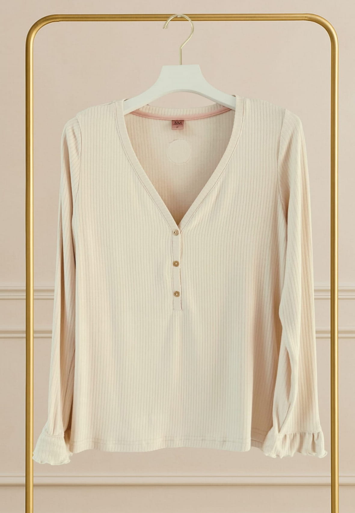 Bluzka do spania z długim rękawem emanuje subtelnym romantyzmem i delikatnością. Dekolt typu V, wykończony pięknymi miedzianymi guzikami, dodaje bluzce szyku, a delikatna falbanka na zakończenie rękawów podkreśla jej kobiecy charakter. Haftowane logo na tyle bluzki to detal, który dodatkowo wzbogaca jej wyrafinowany wygląd.