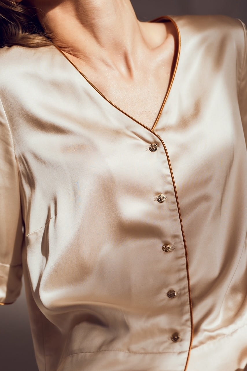 - Dekolt w literę V i subtelne zapięcie na efektowne, złote guziki